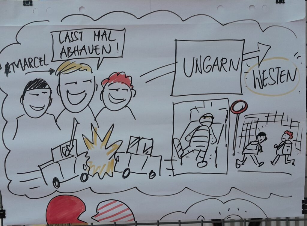 „Ich habe die Umbruchszeiten als Teenagerin erlebt. Für mich veränderte sich alles Gewohnte um mich herum und das habe ich als sehr traumatisierend erlebt. Die DDR war für mich als Kind schön und ich war ärgerlich, wenn andere das anders sahen. Die Beschäftigung mit den unterschiedlichen Geschichten in diesem Workshop-Projekt hat mir geholfen, zu verstehen, dass es auch andere Erlebnisse und Geschichten gab. Das war wichtig für mich.“