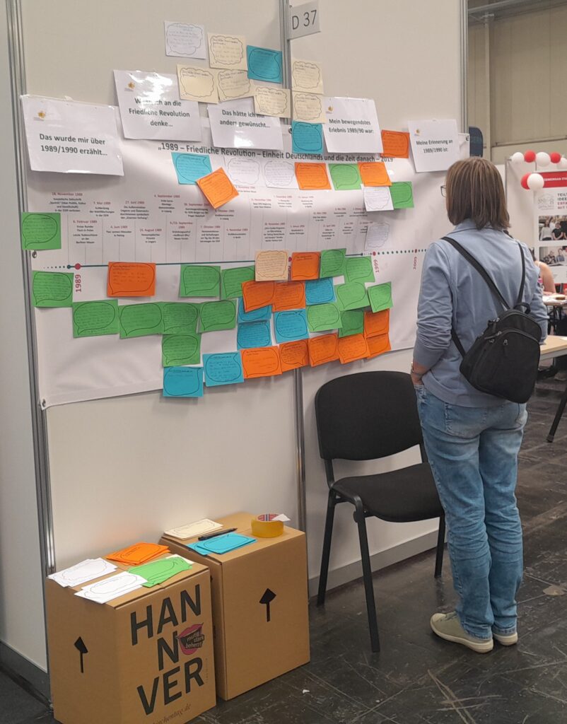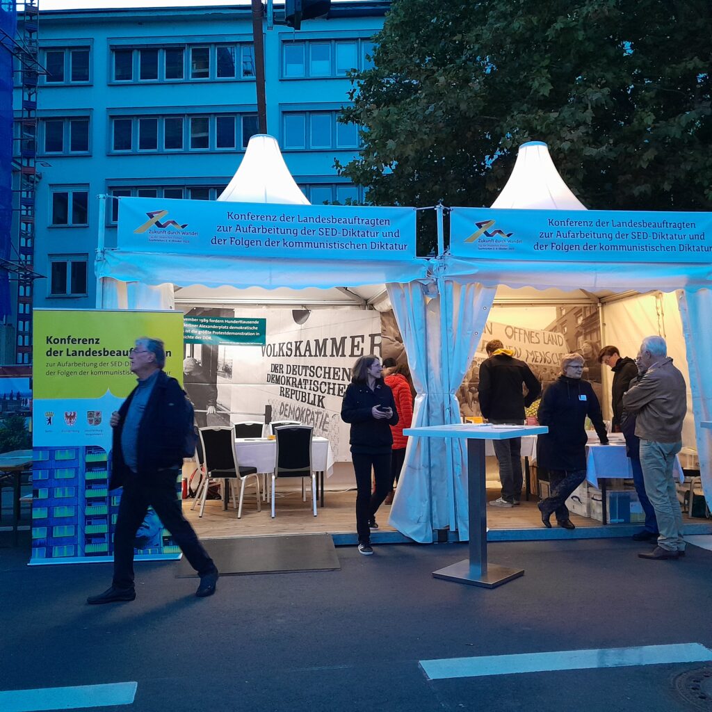 Mit dem Gesprächsangebot zu 35 Jahre Revolution und Einheit war die Aufarbeitungsbeauftragte auch am Evangelischen Kirchentag im Mai 2025 in Hannover und am Tag der Deutschen Einheit im Oktober 2025 in Saarbrücken vertreten. Bereichernd und eindrücklich waren die berichteten Erinnerungen an die deutsche Teilung und den Mauerfall von Menschen aus der alten Bundesrepublik. Viele erzählten von ihren – zum Teil mit Ängsten behafteten – Grenzübertritten zu DDR-Zeiten, von geschmuggelten Hilfen bei Besuchen in kirchlichen Partnergemeinden oder bereichernden Begegnungen. Im persönlichen Bereich spielte die Freude über die wiedervereinten Familien nach dem 9. November 1989 bei Menschen in Ost und West eine mit vielen Emotionen verbundene Erinnerung.