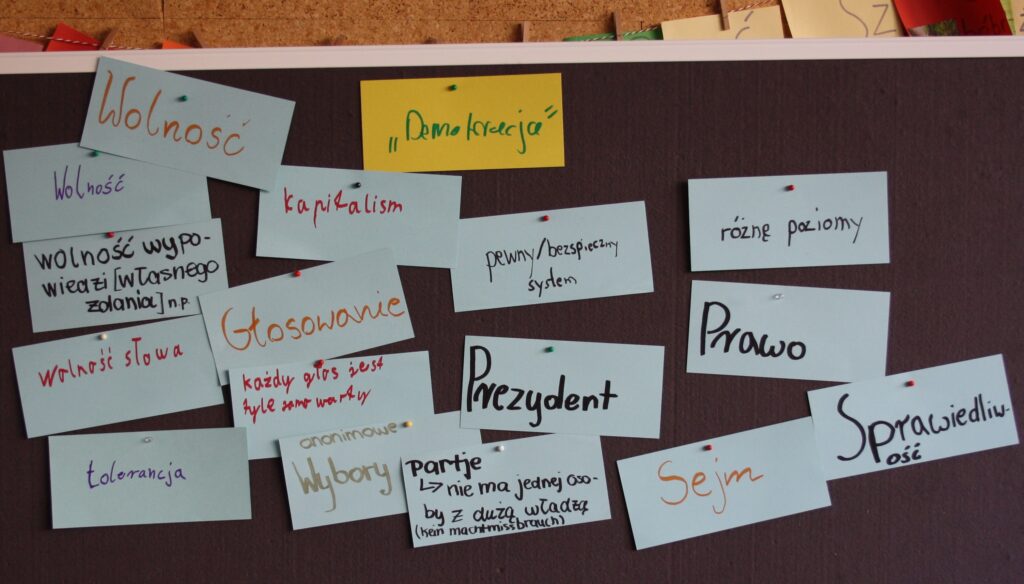 Zu Beginn setzten sich die Teilnehmenden am Beispiel der Weimarer Republik mit der Frage auseinander, was es generell bedeutet, wenn sich eine Demokratie in eine Diktatur verwandelt. Diskutiert wurden die Schwäche der damaligen Verfassung, das Ermächtigungsgesetz von 1933 und der Übergang in die NS-Diktatur. Mit Blick auf die 1980er Jahre wurde dann der umgekehrte Prozess von der (kommunistischen) Diktatur zur Demokratie in Polen und der DDR beleuchtet. Gefragt wurde, wie die Machtstrukturen durch das Einfordern demokratischer Rechte – zuerst durch die Arbeiterbewegung der Solidarność und dann durch die ostdeutsche Bürgerbewegung – schrittweise aufgebrochen wurden. Die Schülerinnen und Schüler entwarfen dazu Plakate, deren Ergebnisse sie sich gegenseitig vorstellten. Abschließend überlegten sie, was sich anhand der behandelten Ereignisse über Demokratie und den Kampf für demokratische Werte lernen lässt.