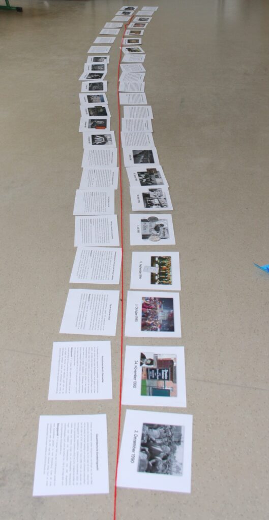 Im Rahmen unseres Bildungsangebots für Schulen hat unser Referent für historisch-politische Jugendbildung, Sebastian Borchers, mit zwei Geschichtsleistungskursen der 12. Jahrgangsstufe über die Dauer von vier Unterrichtsstunden zur Friedlichen Revolution und zur Deutschen Einheit gearbeitet. Die Schülerinnen und Schüler setzten sich u. a. mit abstrakten Begriffen wie „Diktatur“ und „Demokratie“ auseinander, erörterten Fragen von Anpassung, Zwang und Unrecht in der SED-Diktatur und schlüsselten die Abfolge der Ereignisse 1989/90 mithilfe eines „Zeitstrahls“ auf.