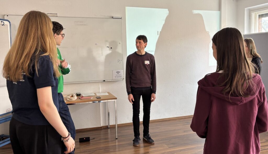 In einem Praxis-Workshop erarbeitete Sebastian Borchers (LAkD) mit den Jugendlichen, wer Zeitzeuginnen und Zeitzeugen sind und wie respektvolle Befragungen gelingen können. Außerdem stellte er einen Leitfaden zur Gesprächsvorbereitung vor. Danach wurden Interviewsituationen geübt, indem Jugendliche nacheinander in die Rollen des Interviewers, der Zeitzeugen und der Beobachter schlüpften. Nach einer Blitzlicht-Auswertung gab Borchers noch Tipps, was für gute Audio- und Video-Aufnahmen und die Klärung der Veröffentlichungsrechte zu beachten ist.